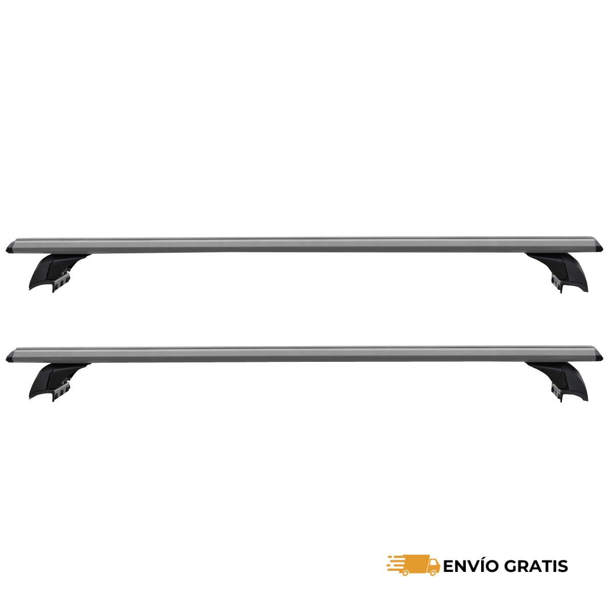 Juego de barras porta equipaje universales fabricadas en aluminio de alta resistencia, diseñadas para instalarse exclusivamente sobre rieles laterales levantados ya existentes en el vehículo. Su diseño robusto y seguro permite transportar carga adicional, manteniendo un ajuste firme y evitando daños gracias a sus gomas protectoras.