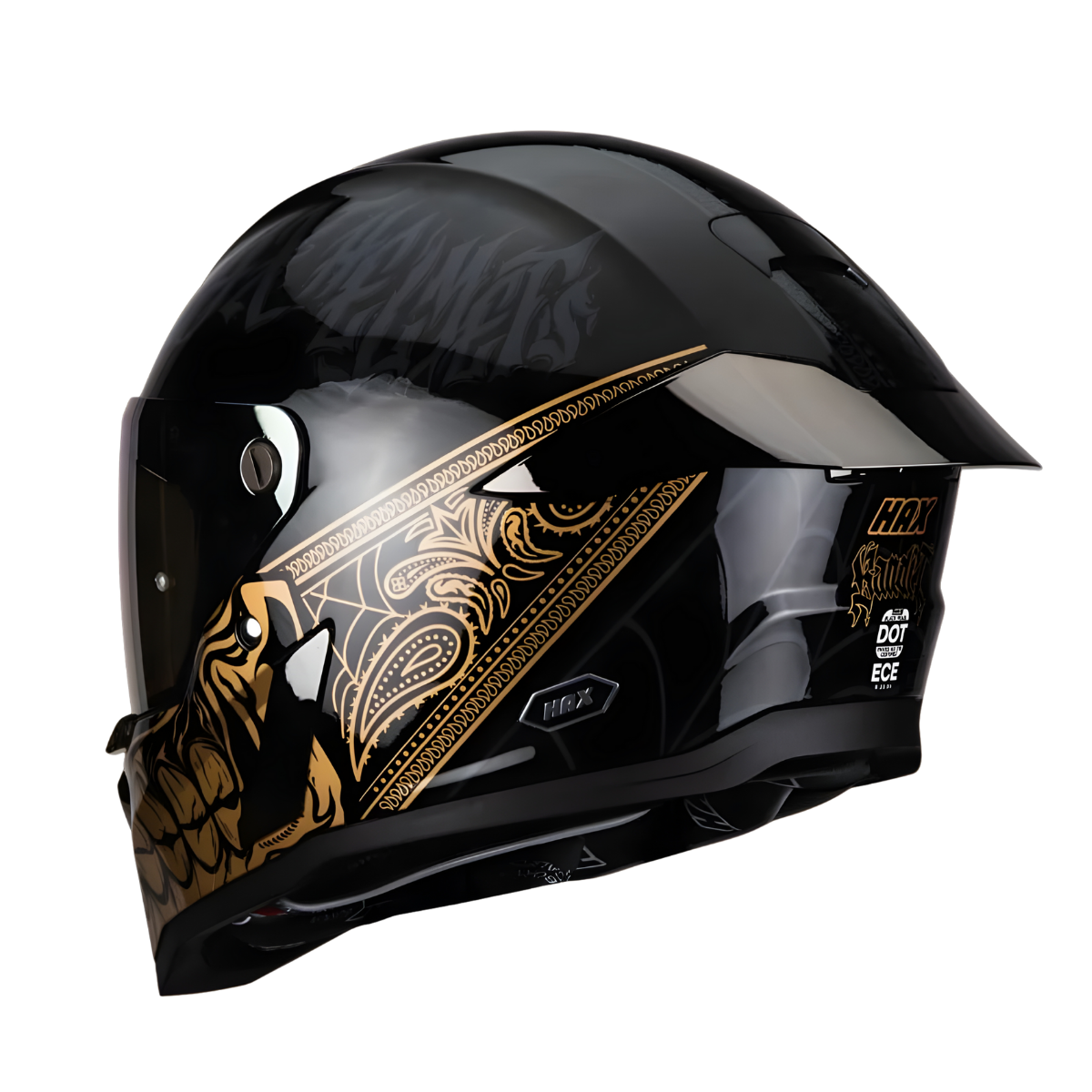 El Casco Integral HAX Black Pearl Bandit combina máxima seguridad, diseño agresivo y gran comodidad, ideal para motociclistas que buscan protección confiable sin sacrificar estilo. Su acabado negro con detalles dorado brillo le da una apariencia elegante y deportiva, perfecta tanto para uso urbano como carretera.